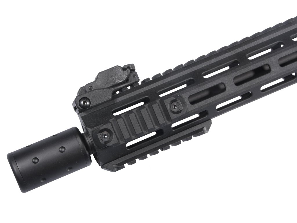 - Mířidla a hlaveň: Zbraň je vybavena nastavitelnými zadními a předními mířidly namontovanými na liště RIS a hlavní se 14mm levotočivým závitem pro montáž tlumiče nebo jiného příslušenství.
