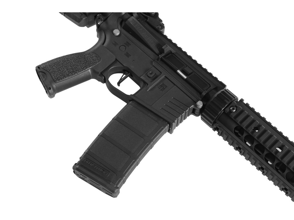Nejnovější generace zbraní AR15 - M4 od Delta Armory je tady! Řada BRAVO se vyznačuje především odolným tělem z ABS polymeru a CNC obráběným kovovým předpažbím.Z vnitřních částí je to především SHS píst s celokovovým ozubením, SHS klika pístního kola, ložiskový trn, otočná hop-up komora, zesílený mechabox, který dlouhotrvající pružina 120-130 a přesná hlaveň 6,03 mm, kovová kluzná ložiska 7 mm, odolná kovová kolečka a páka podavače SHS a rychlovýměnná pružina QRS gen. 2 - výměna pružiny bez nutnosti demontáže zbraně. Ani vnější zpracování nezaostává za vnitřním. Předpažbí, vnější hlaveň, spoušť, oko závěsu jsou vyrobeny z kovu. Tělo zbraně je vyrobeno z odolného ABS polymeru, který má mnohem lepší vlastnosti než klasický plast. Spoušť - typ CNC. A, která je součástí řady BRAVO, lze obvykle vidět pouze u modernizovaných nebo špičkových zbraní. Zbraň má také unikátní sériové číslo. Pažba je mnohem lépe navržena než u jiných značek v podobné cenové relaci a vkládání baterie je mnohem pohodlnější.