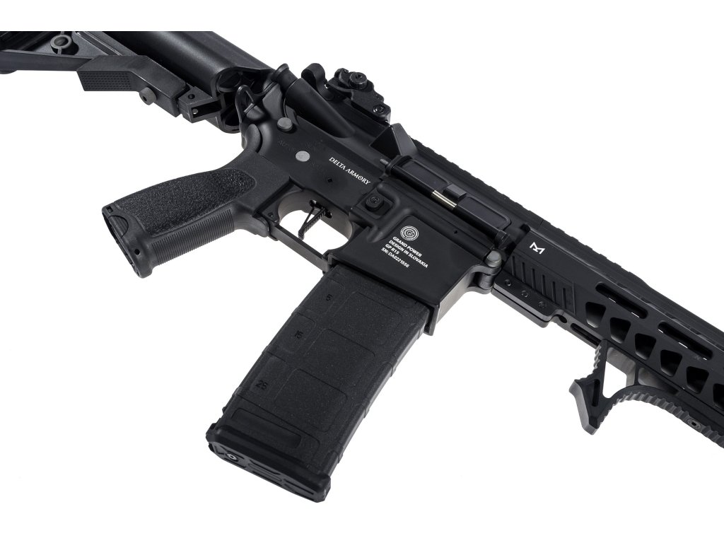 Nejnovější generace AR15 - M4 od výrobce Delta Armory. Řada DA-GP je v licenci slovenského výrobce skutečných zbraní Grandpower, který v roce 2022 zahájil výrobu ostrých zbraní M4/AR15, díky čemuž najdete na těle zbraně logo Grandpower. Řada ALPHA se vyznačuje především svou FULL METAL konstrukcí, kdy je celá zbraň (předpažbí, tělo, spoušť, poutko na popruh a další menší vnější části) vyrobena z kovu. Spoušť je typu CNC A, což urychluje reakční dobu zbraně. Zbraň má také unikátní sériové číslo. Pažba je mnohem lépe navržena než u jiných značek v podobné cenové relaci a vkládání baterie je mnohem pohodlnější. Na zbrani jsou 22mm lišty RIS, na které je možné namontovat různé příslušenství. K dispozici je stavitelná zadní muška, namontovaná na liště RIS. Hlaveň je zakončena 14 mm levotočivým závitem.
