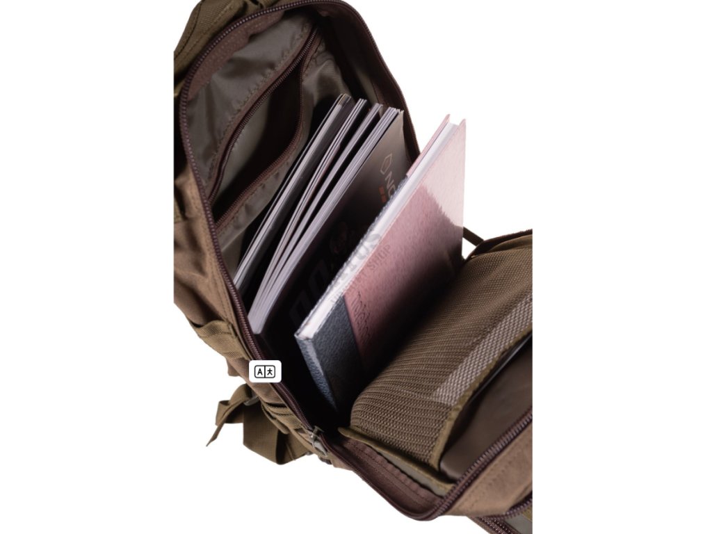 Taktický batoh je velmi pohodlný, prostorný a praktický. Popruhy lze nastavit dvěma způsoby: ve výšce ramen a ve spodní části batohu. Popruhy jsou vycpané měkkým polstrováním, čímž chrání ramena a zajišťují pohodlné nošení po celý den. V zadní části je úložný prostor pro hydratační vložku. Největší vnitřní kapsa se uzavírá zipem, který vede téměř po celém obvodu batohu, s výjimkou dna. Na přední straně jsou další dvě kapsy. Další kapsy a předměty lze k batohu připevnit pomocí systému MOLLE pro případ delšího výletu nebo pobytu v přírodě. Batoh je vhodný i jako kvalitní školní batoh. Má spoustu kapes, které poskytují dostatek prostoru pro učebnice velikosti A4.