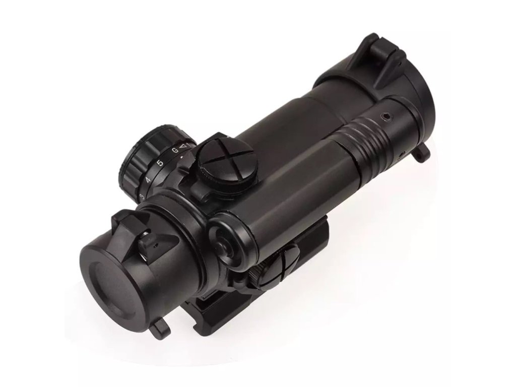 Kolimátor M4 Red/Green Dot s ukazatelem od společnosti Aim-O. Tento kolimátor je vhodný pro 20mm lišty Ris. Má 5 úrovní nastavení jasu červeného/zeleného bodu a plastový výklopný protiprachový kryt přední a zadní čočky. Délka: 140 mm. Střelky nejsou součástí dodávky.
