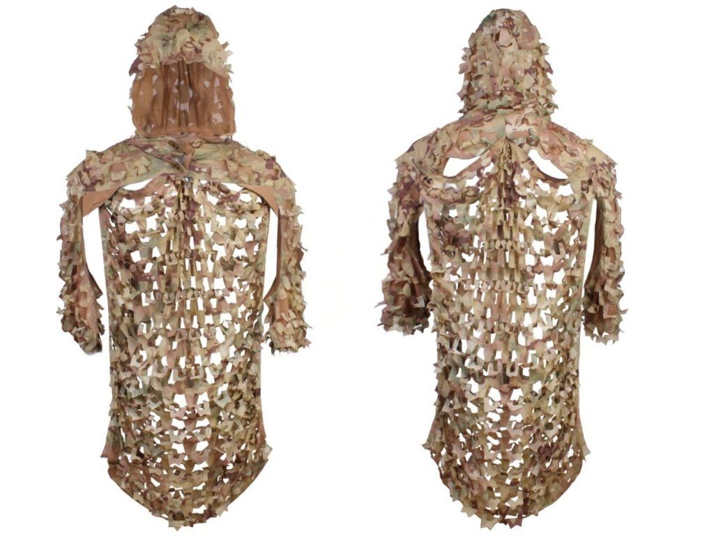 Maskáčový kabát Ghilie s odnímatelnými rukávy a kapucí. Rukávy jsou po celé délce otevřené, což zvyšuje pohodlí při pohybu. Plášť je vhodným doplňkem pro odstřelovačské maskování, snadno se obléká na uniformu nebo vestu. Zapíná se pod krkem na knoflík. Splývá přes ramena a zpět až ke stehnům. Dodává se v malém rozměrném látkovém sáčku na šňůrku (balíčku). Sáček má očko, takže kabát můžete připevnit k opasku nebo k výpletu Molle. Velkou výhodou je, že střelec nosí tento kabát zavalený na opasku nebo vestě. V případě potřeby jej může sundat a obléknout. Chytrý střih nebrání přístupu k výrazným kapsám na vestě ani ke kapsám na bocích či rukávech. Hmotnost je velmi nízká a střelec ji na sobě prakticky necítí. Na rozdíl od tradičního odstřelovačského obleku se tato vesta velmi rychle obléká a podle potřeby zase sbalí. Bunda je univerzální a je vyrobena z odolného nylonu Cordura 1000D.