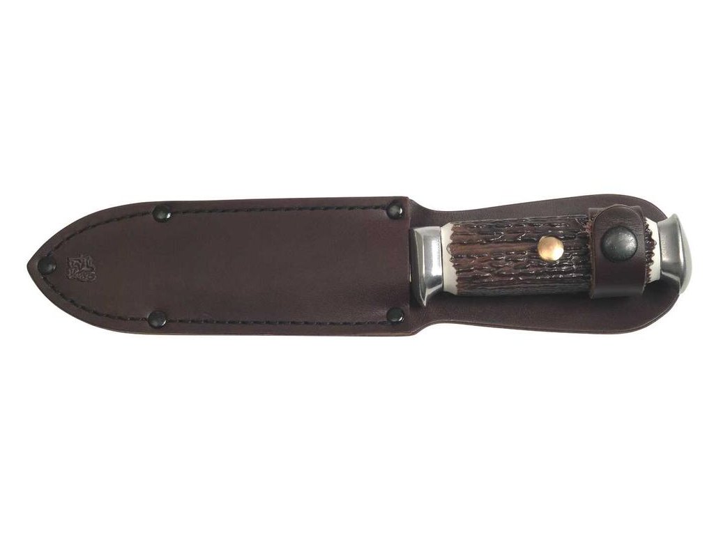 Střenka této lovecké dýky je velmi zdařilou imitací jeleního parohu.