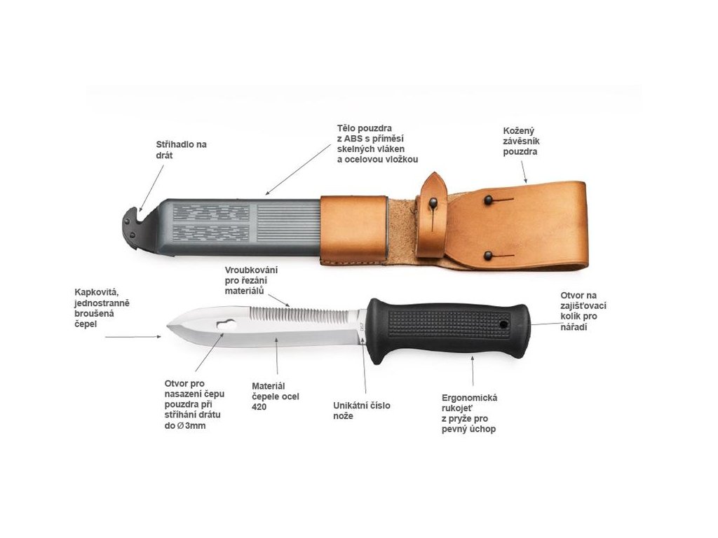 Vyrobit ho nebylo vůbec snadné. Na základě několika málo zachovaných prototypů a torza výkresů bylo třeba připravit technickou dokumentaci, navrhnout výrobní přípravky, vypracovat technologické postupy, nakreslit a otestovat formy pro plastová pouzdra a rukojeti. Složitá byla také náhrada některých materiálů, které se v průběhu uplynulých desetiletích přestaly vyrábět. Čepel nože je vyrobena z oceli 420 o tvrdosti 54-56 HRc tak, aby vydržela náročné podmínky a byla odolná vůči opotřebení. Má délku 134,5 mm a je dvoubřitá, kapkovitého, téměr symetrického tvaru se středovým hrotem. Čepel je ostřená pouze ma jedné spodní hraně. Na horní jednostranně broušené hraně je vypracováno zoubkování pod sklonem výbrusu a to v délce dvou třetin délky čepele. To mělo sloužit pro napilování silných drátů před stříháním.