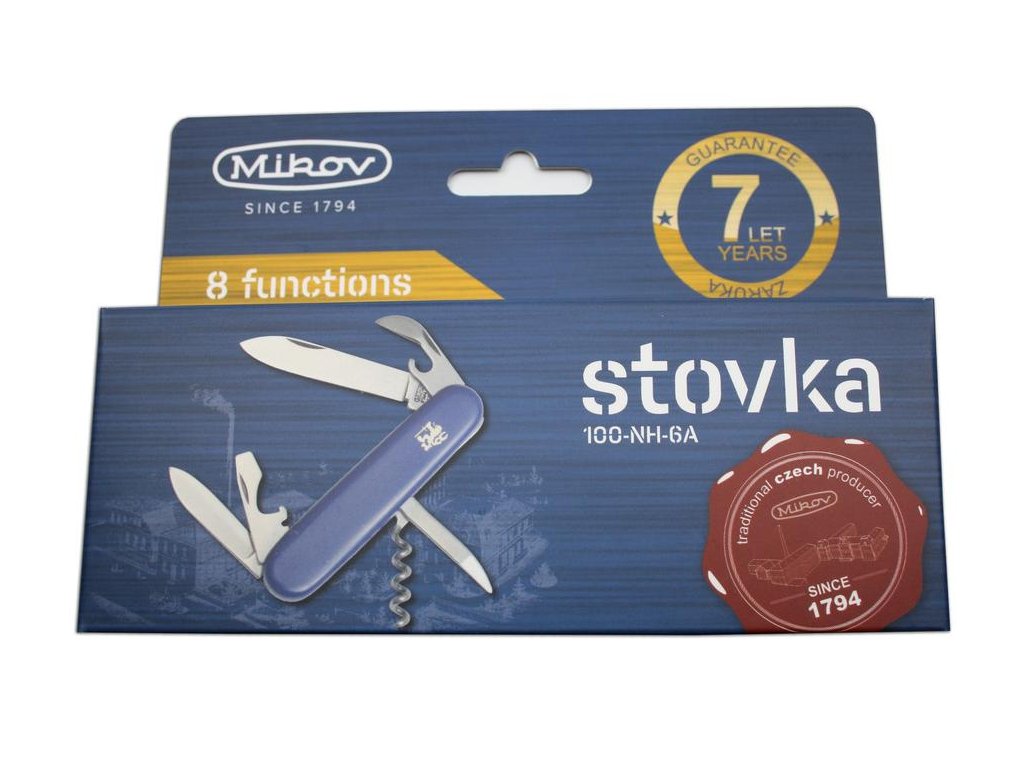Stovka je tradiční kapesní zavírací nůž. Jednou z mnoha výhod Stovky je velikost, vejde se do každé kapsy a je proto ideálním společníkem pro každou příležitost. Příkladem využití může být táboření, krájení potravin, využití v přírodě nebo při práci na zahradě. Čepel kapesního nože Stovka je vyrobena z kvalitní nerezové oceli 420, elegantní střenka je vyrobena z odolného plastu, díky které padne do každé ruky. Stovka je kvalitní výrobek nožířské firmy Mikov, která sídlí v srdci Českého Švýcarska ve městě Mikulášovice. Počet funkcí: 8