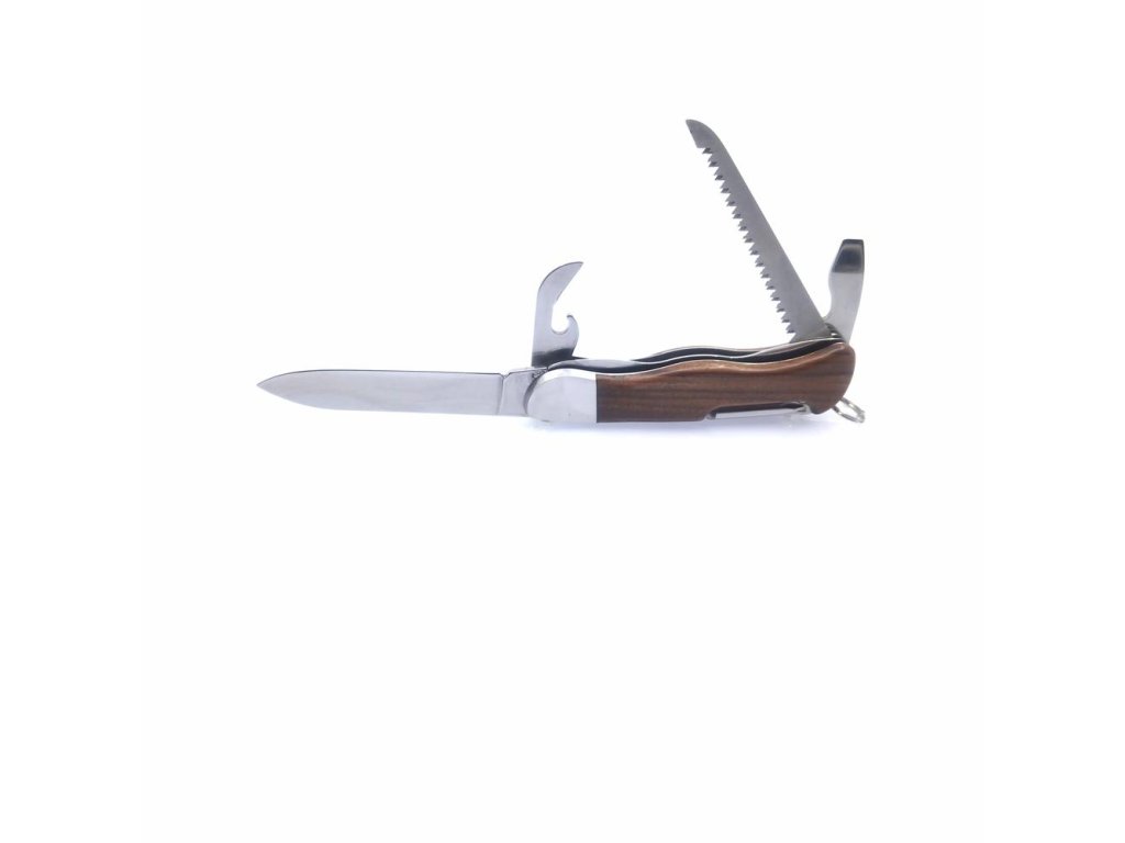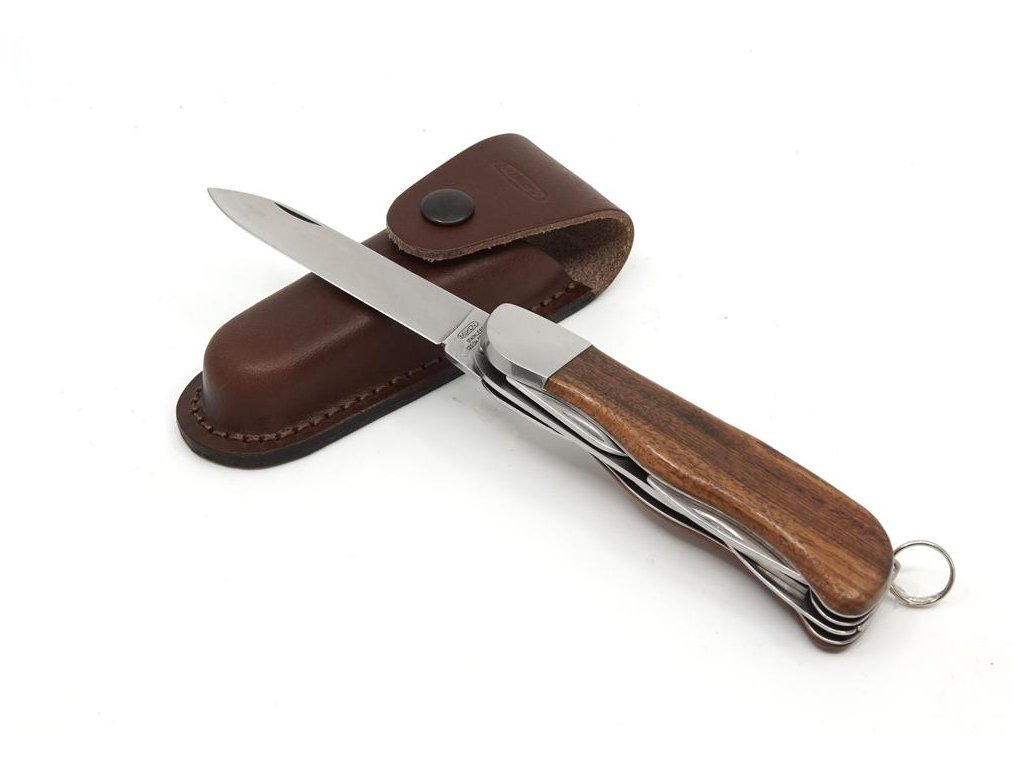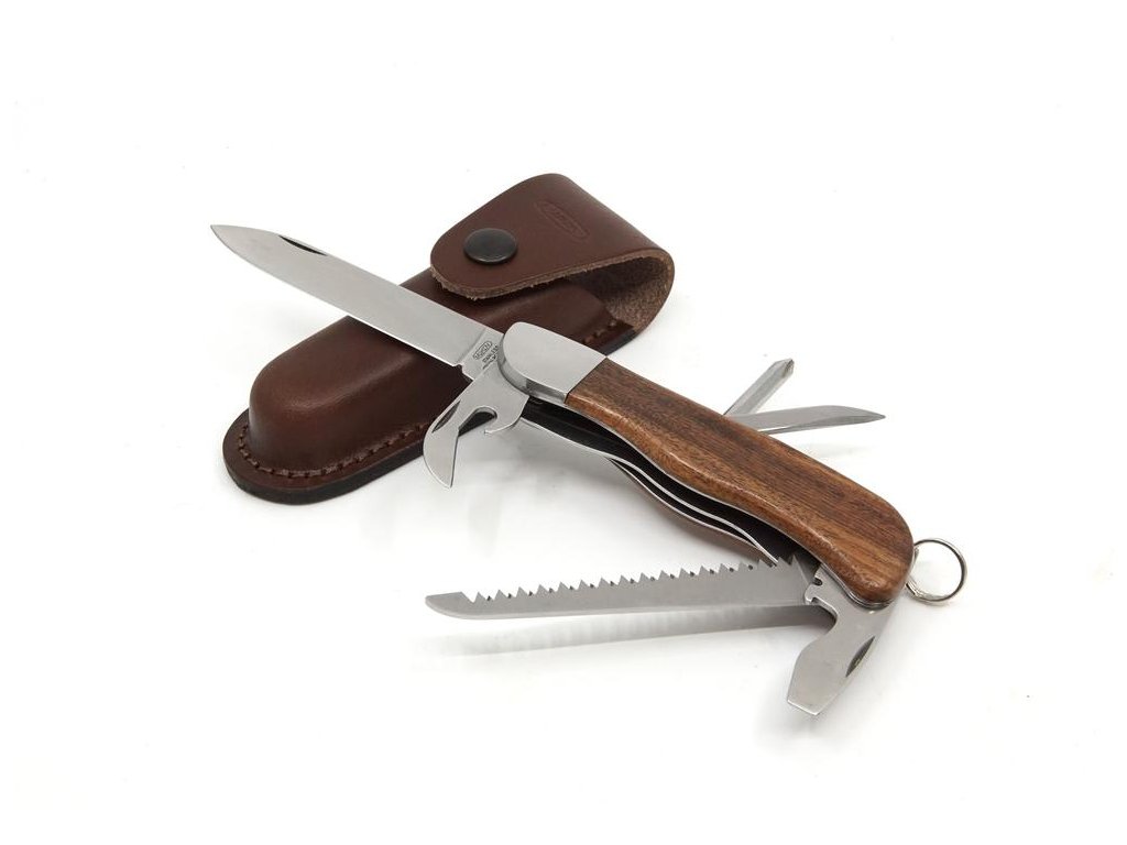 VYBAVENÍ: Čepel kapesního zavíracího nože HIKER je vyrobena z kvalitní nerezové oceli 420 o tvrdosti 53-55HRc. Tento kapesní zavírací nůž HIKER je vybaven kvalitní pilkou s dvěma řadami zubů, otvírákem na konzervy, křížovým šroubovákem, bodcem a otvírákem na láhve, který má drážku na odizolování vodičů nebo ho lze také použít jako plochý šroubovák. Kapesní zavírací nůž HIKER má kování a střenku vyrobenou z kvalitního exotického dřeva Palisandr. Kapesní zavírací nůž HIKER je také vybaven kroužkem pro uchycení a je dodáván v koženém pouzdře s logem Mikov. Počet funkcí: 7