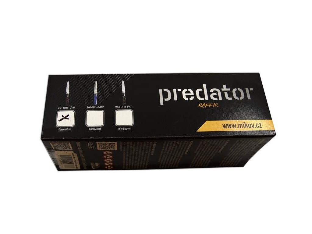 Nůž PREDATOR je vyhazovací, automatický nůž firmy Mikov, která sídlí v srdci Českého Švýcarska ve městě Mikulášovice. Jednou z mnoha výhod nože PREDATOR je, že se nůž dá rychle otevřít jednou rukou. Čepel nože je vyrobena z vysoce kvalitní oceli Bőhler N690 s tvrdostí 57-60 HRc. Střenka nože je vyrobena z materiálu zvaného RAFFIR. Jedná se o nový materiál, který je odolný a příjemný do ruky. Její ergonomický tvar ve spojení s ostatními díly dává vyniknout nádhernému a propracovanému tvaru nože s doplňujícím názvem PREDATOR RAFFIR. Nůž má luxusní a elegantní design. PREDATOR RAFFIR je vyráběn pouze v jednodílném provedení a je dodáván s luxusním koženým pouzdrem s poutkem na opasek.