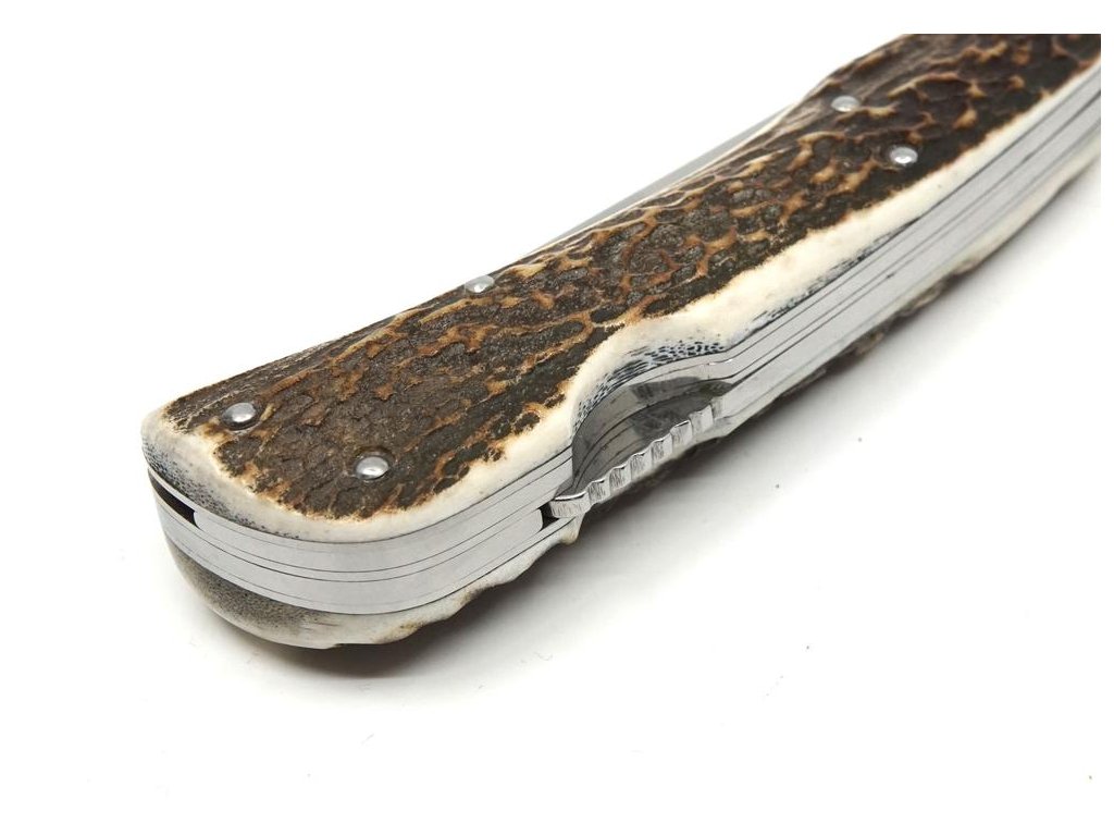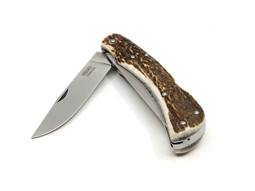 Pro výrobu střenky loveckého nože HUBERT jsme použili pravé jelení paroží. Čepel je vyrobena z kvalitní nerezové oceli 440A o tvrdosti 54-57 HRc. Čepel loveckého nože HUBERT je jištěna bezpečnostní pojistkou backlock. Lovecký nůž HUBERT je vybaven také velkou praktickou prodlouženou pilkou s otvíráním z čela nože - bez nehetníku, bez pojistky. Lovecký nůž HUBERT je dodáván včetně kvalitního koženého pouzdra s logem Mikov.