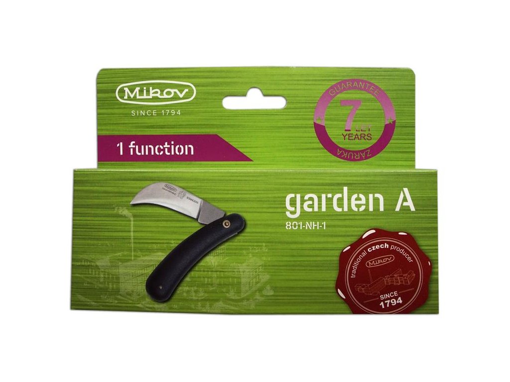 | Popis EN: | KNIFE 801-NH-1<br><br>Professional gardening knives from the Czech knife manufacturer Mikov, based in Mikulášovice in Bohemian Switzerland, are a combination of tradition, craftsmanship and modern technology.<br><br>Double – edged curved knife<br><br> The double-edged knife with a wider curved blade is used to clean larger cuts after sawing, to prune more delicate trees and to rejuvenate overgrown shrubs and trees. You can use it when working with ornamental and fruit trees.<br>Most of these knives are closing.<br><br>The blade with the Mikov logo is made of high-quality 420 stainless steel with a hardness of 53-55 HRc with high cutting power.<br>The handles are made of highly durable plastic. |