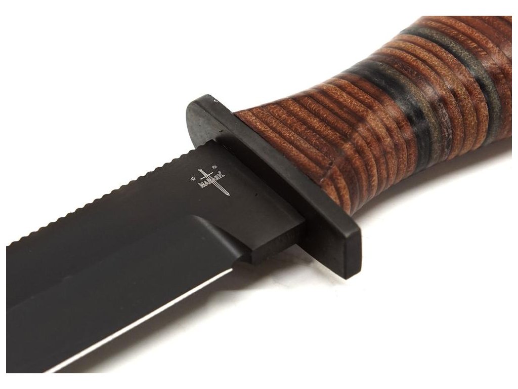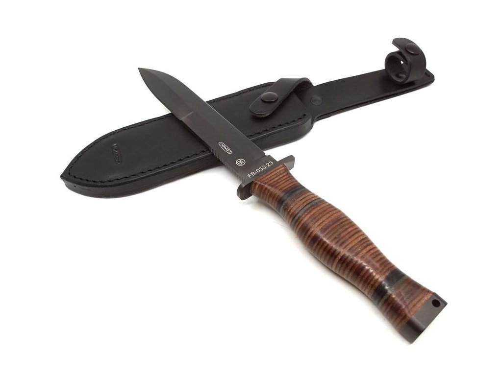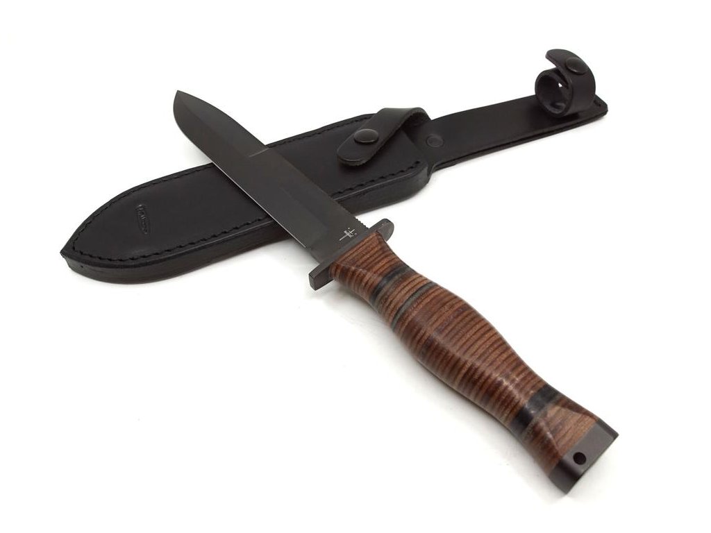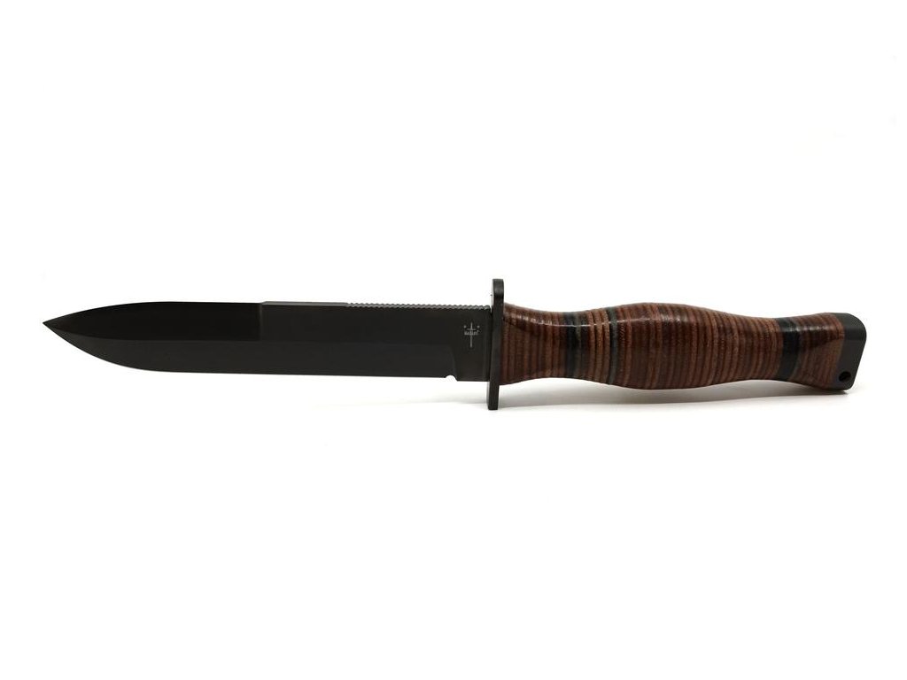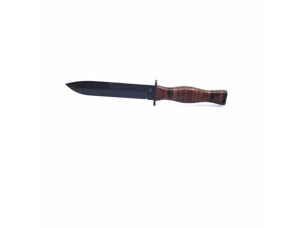 | Popis CZ: | Bojový nůž , horní ostří broušeno do své poloviny.<br>Délka čepele 17 cm, celková délka nože 30 cm.<br>Materiál N690, síla materiálu 4,5 mm.<br>Rukojeť z oválných kroužků. Hlavice s otvorem pro závěsnou šňůru. Nůž FALCO je dodáván s černou koženou pochvou.<br><br>Nůž je určený k prodeji široké veřejnosti.<br><br> |