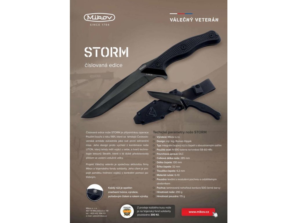 Projekt válečný veterán je společnou aktivitou firmy Mikov a Vojenského fondu solidarity. Jeho cílem je propojit památku hrdinství vojáků s konkrétní pomocí potřebným. Z každého prodaného nože STORM bude poukázáno 300 Kč Vojenskému fondu solidarity