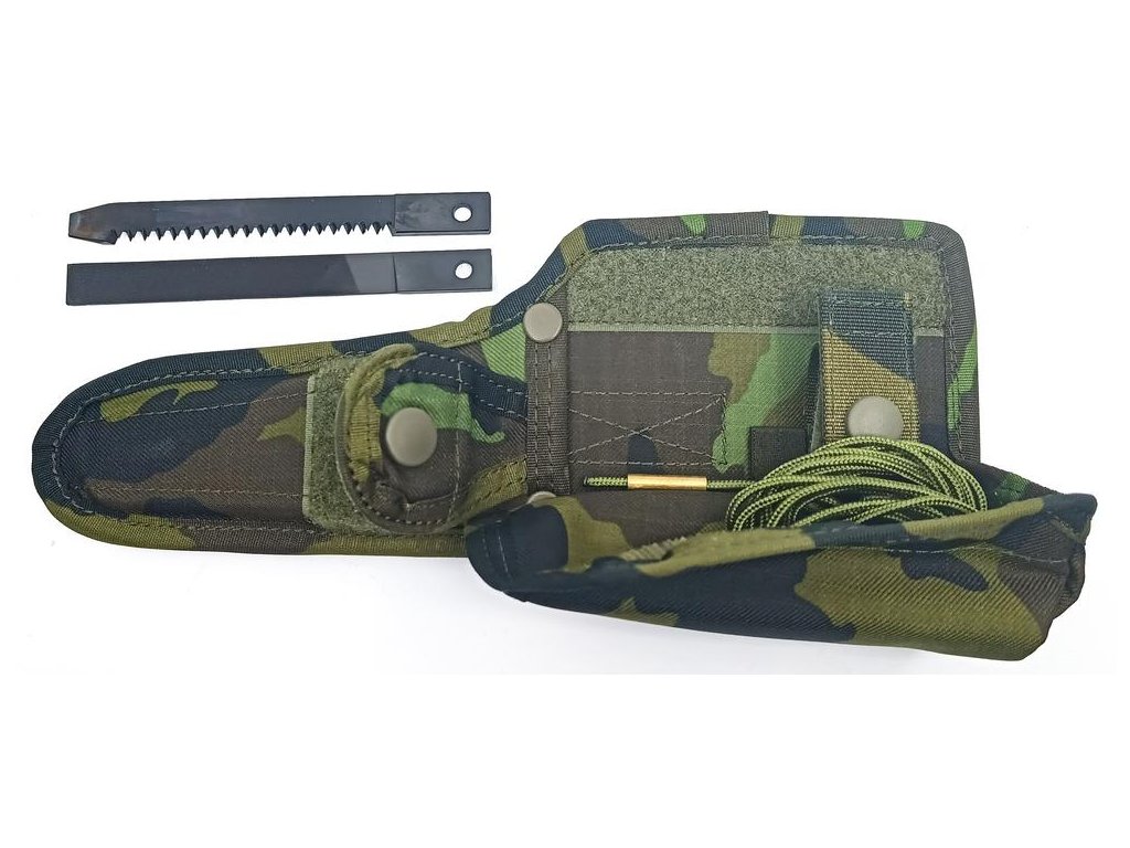 Pouzdro je kryté a je vybavené pilkou, pilníkem a zelenou šňůrou paracord.