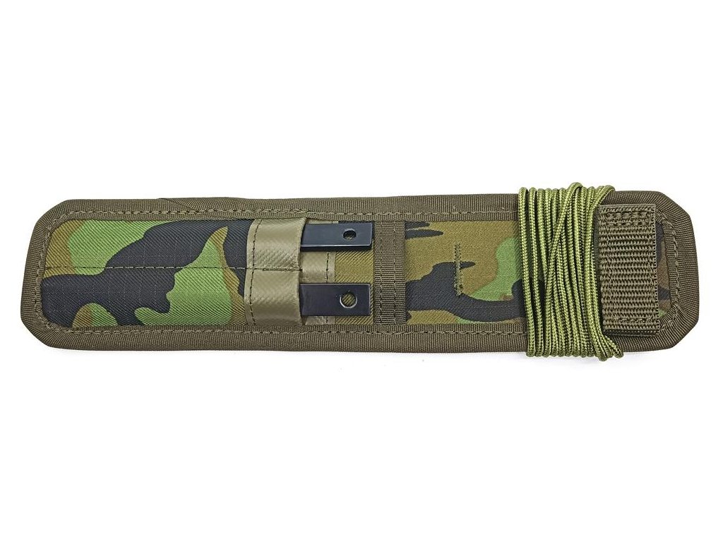 POUZDRO UTON 362-4 CAMOUFLAGE – textilní maskáčové pouzdro zelené s kapsičkou na příslušenství. U tohoto pouzdra není klasická kovová planžeta, jako u kožených pouzder, ale je tam všitá výztuha, která též brání vypadnutí nože z pouzdra. Pouzdro je vybaveno pilkou, pilníkem a šňůrou paracord zelené barvy