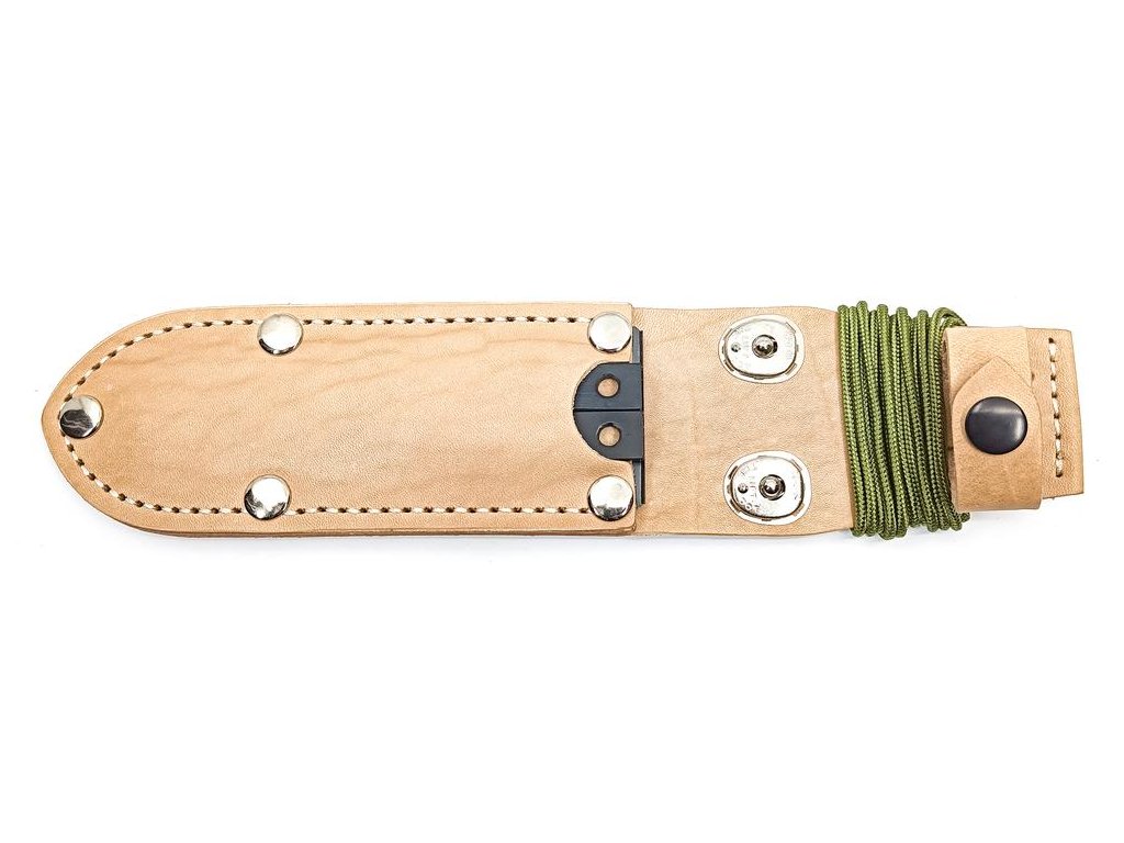 POUZDRO UTON 362-4 NATUR LEATHER-Nickel – světlé kožené pouzdro s kapsičkou na příslušenství a niklovanými pevnostními knoflíky KIN DOT, včetně kovové planžety bránící samovolnému vypadnutí dýky. Pouzdro je vybaveno pilkou, pilníkem a šňůrou paracord zelené barvy.