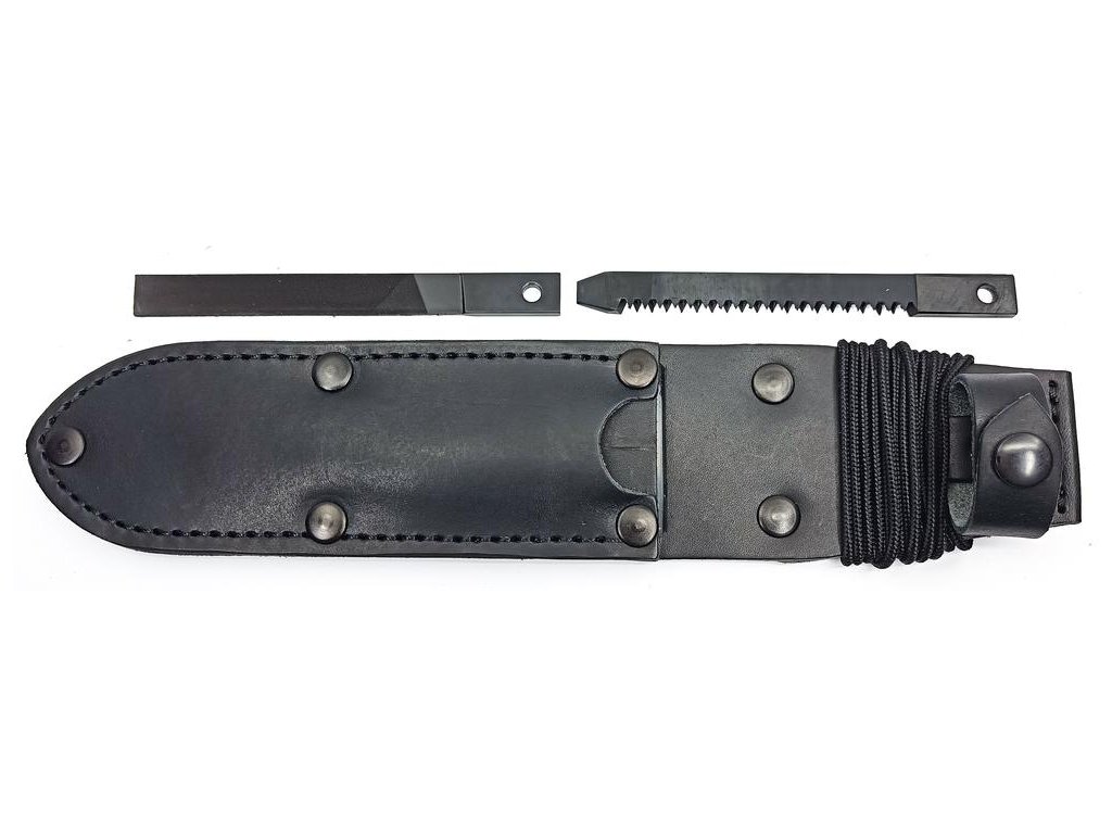 POUZDRO UTON AZ-4– černé kožené pouzdro s kapsičkou na příslušenství včetně kovové planžety bránící samovolnému vypadnutí dýky. Pouzdro je vybaveno pilkou, pilníkem a šňůrou paracord černé barvy.
