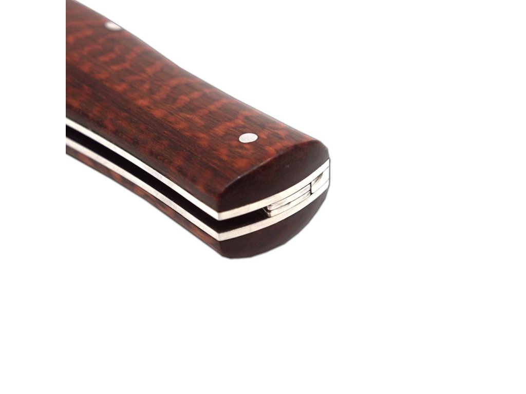 Z damascenské oceli jsou i další součástky – konkrétně přední kování, pojistná páčka. Má zdobené hřbetní pero. Střenka nože je vyrobena z kvalitního exotického dřeva, konkrétně SNAKE WOOD. Hadí dřevo pochází ze stromu rostoucího v Jižní Americe, zvláště v Surinamu a Francouzské Guayaně. Strom, jehož latinský název je Loxopterygium sogotii, se tam nazývá hububalli. Barva dřeva přechází od středu jádra směrem ven od žlutohnědé do červenohnědé. Jedná se o poměrně tvrdý druh dřeva. Všechny přírodní materiály jsou nakupovány pouze v souvislosti s platnou legislativou a v zájmu ochrany přírody. Svým tvarem zaručuje nejen příjemný a pevný úchop, ale zároveň brání sklouznutí ruky a poranění.