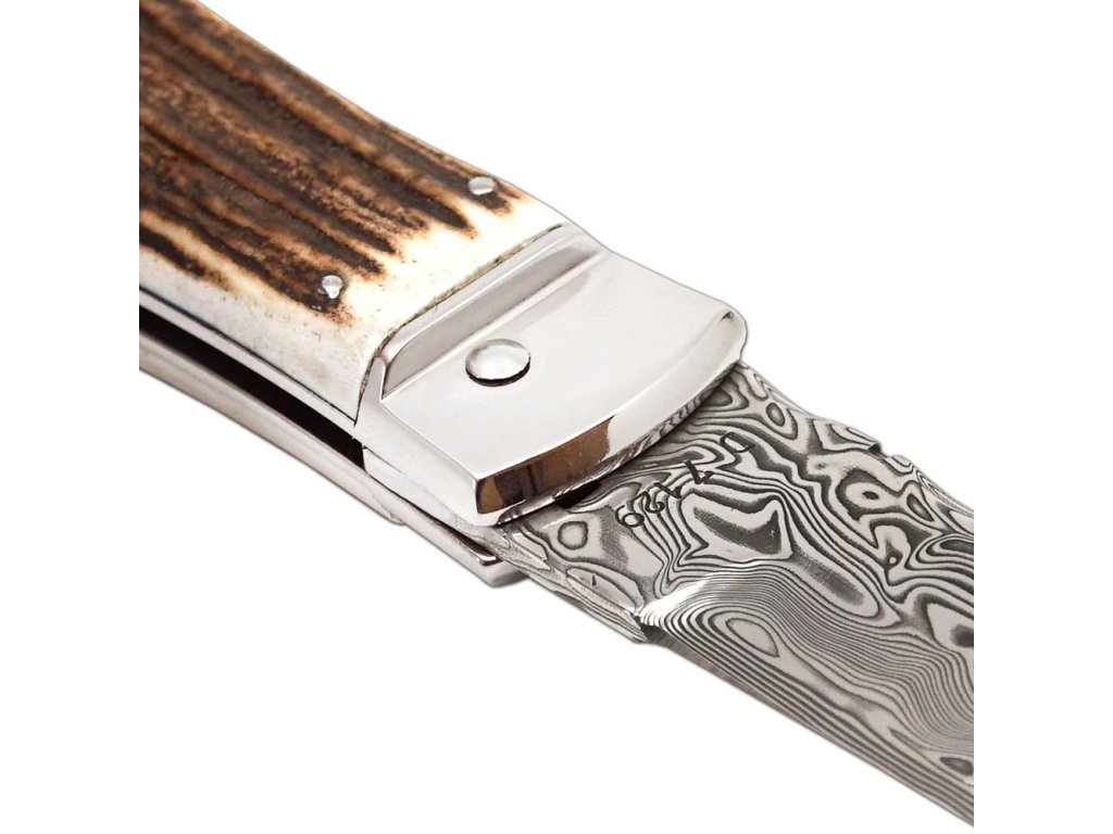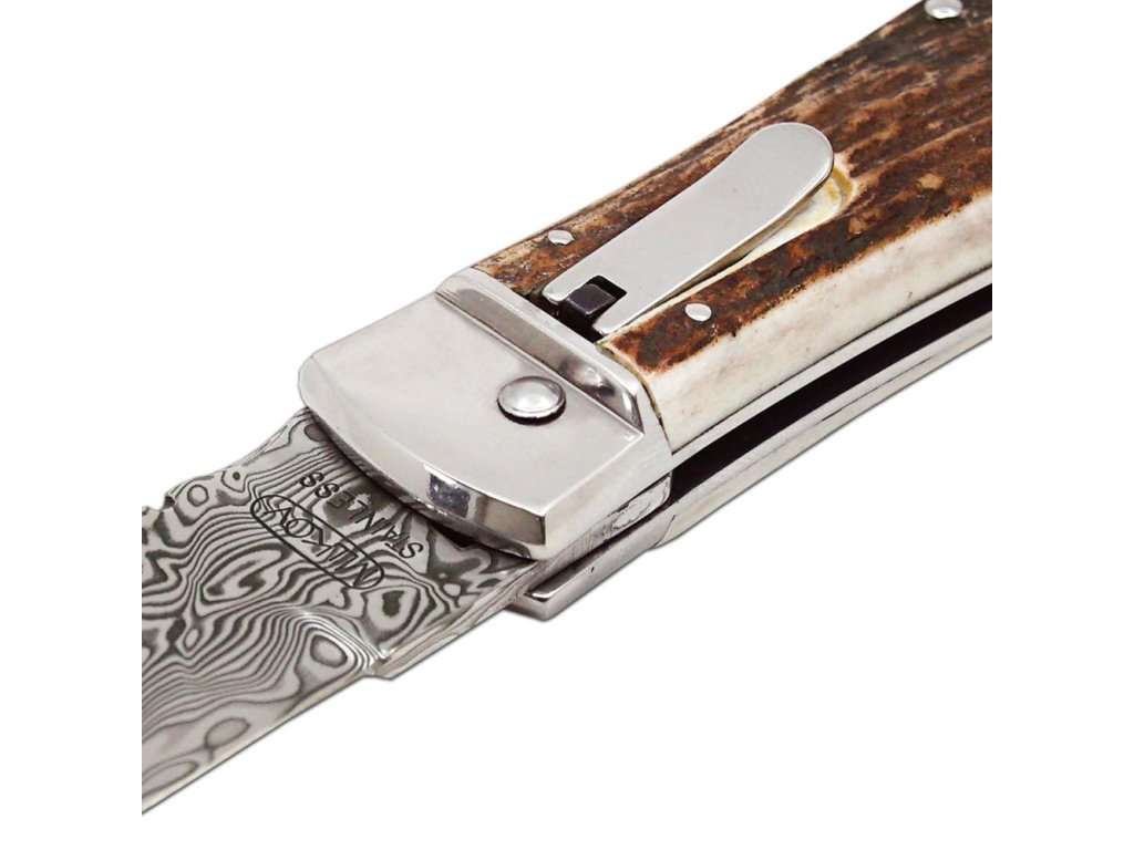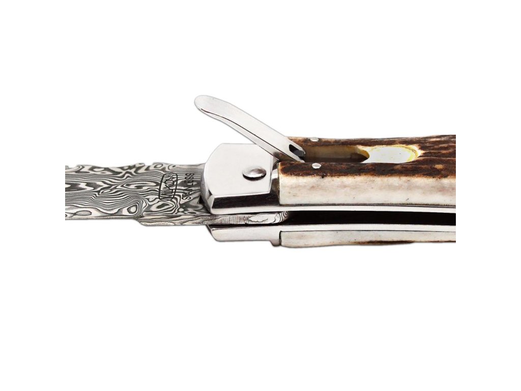 Nůž PREDATOR je vyhazovací, automatický nůž firmy Mikov, která sídlí v srdci Českého Švýcarska ve městě Mikulášovice. Jednou z mnoha výhod PREDATORU je, že se nůž dá rychle otevřít jednou rukou. Čepel nože je vyrobena z vysoce kvalitní damascenské oceli PMC27, která je nejvíce ceněným materiálem na výrobu čepelí. Na světě neexistují dva kusy se stejnou strukturou. V damascenské nerezové oceli PMC27 je spojena houževnatost oceli PMC27 (matný vzor) s tvrdostí oceli RWL34 (lesklý povrch). Výsledný materiál má díky vnitřní struktuře vysokou torzní, ohybovou i rázovou houževnatost a současně velkou odolnost proti opotřebení. Nůž vyrobený z damašku má vysokou řezivost, je extrémně odolný proti přelomení a má krásnou nezaměnitelnou kresbu. Tvrdost použité čepele je 57-60 HRc. Každá čepel je očíslovaná, takže jednotlivé nože jsou jasně identifikovány. Tato indentifikace slouží jednak jako záruka originality, ale také jako bezpečnostní prvek v případě ztráty nebo odcizení. Nůž má zdobené hřbetní pero a horní část čepele. Střenka nože je vyrobena z pravého jeleního parohu, který je velice oblíbený mezi lovci a milovníky přírody. Svým tvarem zaručuje nejen příjemný a pevný úchop, ale zároveň brání sklouznutí ruky a poranění.