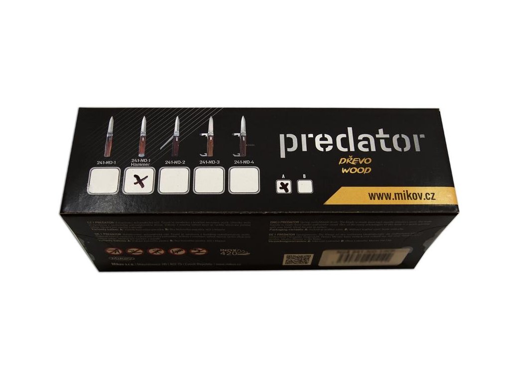 Nůž PREDATOR je vyhazovací, automatický nůž firmy Mikov, která sídlí v srdci Českého Švýcarska ve městě Mikulášovice. Jednou z mnoha výhod nože PREDATOR je, že se nůž dá rychle otevřít jednou rukou. Čepel nože je vyrobena z kvalitní nerezové oceli 420 s tvrdostí 52–55 HRc. Střenka nože je vyrobena z kvalitního exotického dřeva PALISANDER SANTOS. Svým tvarem zaručuje nejen příjemný a pevný úchop, ale zároveň brání sklouznutí ruky a poranění. Nůž je opatřen zadním kováním, které podtrhuje jeho luxusní a zajímavý design. Kování se dá využít jako malé kladívko například k rozbití okna. Každý PREDATOR HAMMER je dodáván včetně luxusního koženého pouzdra s poutkem na opasek. Tento nůž je vyráběn pouze v jednodílném provedení.