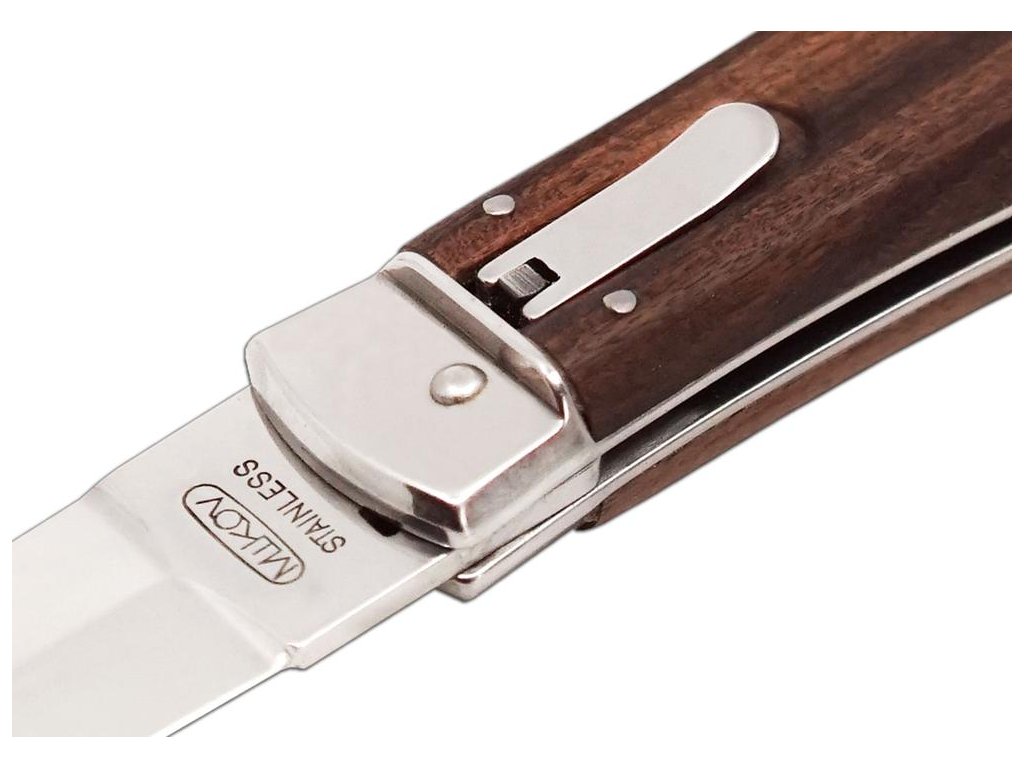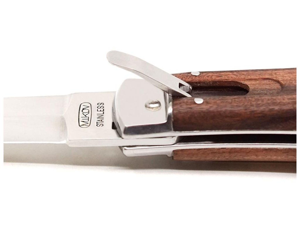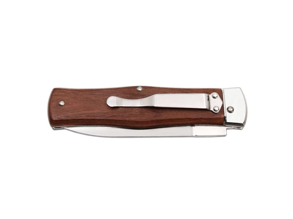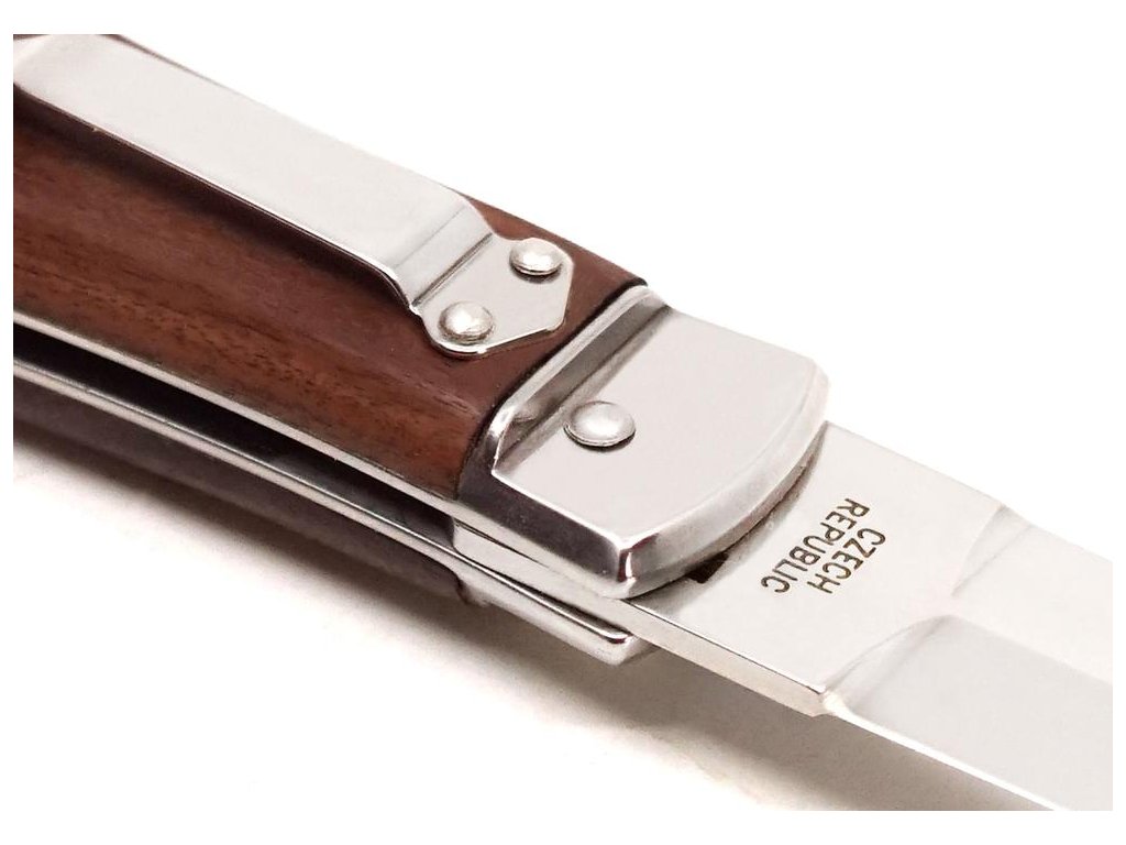 | Popis CZ: | Vyhazovací zavírací nůž 241-ND-1/N KLIP<br><br>Nůž PREDATOR s klipem je vyhazovací, automatický nůž firmy Mikov, která sídlí v srdci Českého Švýcarska ve městě Mikulášovice. Jednou z mnoha výhod nože PREDATOR je, že se nůž dá rychle otevřít jednou rukou.<br>Čepel nože je vyrobena z kvalitní nerezové oceli 420 s tvrdostí 52–55 HRc.<br>Střenka nože je vyrobena z kvalitního exotického dřeva PALISANDER SANTOS. Svým tvarem zaručuje nejen příjemný a pevný úchop, ale zároveň brání sklouznutí ruky a poranění.<br>Na přání zákazníka je možné vyrobit tento nůž i v levorukém provedení (nelze v kombinaci s vývrtkou!), nebo vygravírovat logo či nápis na čepel nože.<br>Nůž je vyráběn v 1–3dílném provedení, tzn. hlavní čepel, pilka, otvírák na konzervy nebo otvírák na lahve se šroubovákem a drážkou pro snadné odizolování kabelů.<br><br>Počet funkcí: 1 <br><br>Vybavení: <br>Čepel<br><br>Materiál:<br>čepel z kvalitní nerezové oceli 420 o tvrdosti 52-55 HRc<br>elegantní střenka z exotického palisandrového dřeva<br><br> |