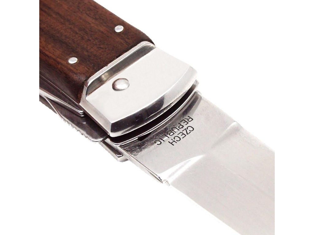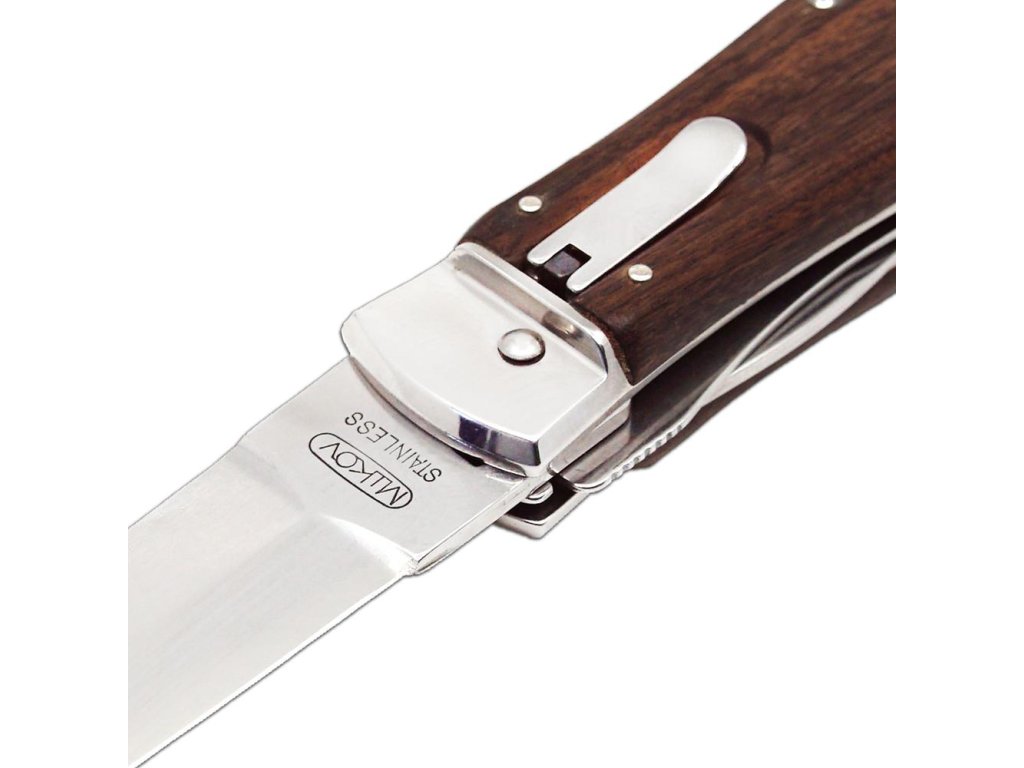 | Popis EN: | Switchblade PREDATOR knife 241-ND-3/KP<br><br>Is Czech made knife with great heritage of Czech knife making. One of the many advantages of PREDATOR is that the knife can be quickly opened with one hand from the side.<br>The knife blade is made of high-quality stainless steel 420 with a hardness of 52–55 HRc.<br>The handle of the knife is made of high-quality exotic PALISANDER SANTOS wood. Its shape not only guarantees a pleasant and firm grip, but also prevents the hand from slipping and injuries. Upon the customer's request, it is possible to produce PREDATOR in a left-handed design (cannot be combined with a corkscrew!) And it is also possible to engrave a logo or lettering on the blade.<br>This PREDATOR is delivered with a luxurious leather case with a belt loop.<br>The knife is manufactured in a 1-6 tool version. For example with the main blade, saw, can opener or bottle opener with screwdriver and groove for easy stripping of cables, corkscrews and small scissors.<br> <br> Number of functions: 3 <br> <br> Equipment: <br> Blade, bottle opener, can opener <br> <br> Material : <br> blade made of high quality stainless steel 420 with a hardness of 52-55 HRc <br> Handle from wood <br> <br> Manufacturer: Mikov Mikulášovice <br> <br>The damaged pen can be easily replaced according to the instructions <a href="https://www.mikov.cz/s18968021-navod-na-vymenu-pera-vyhazovaciho-noze?lang=en">HERE</a><br><br> |