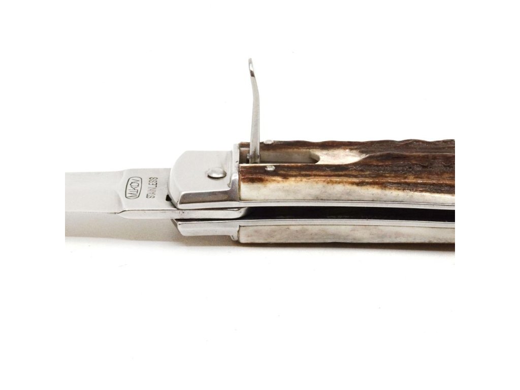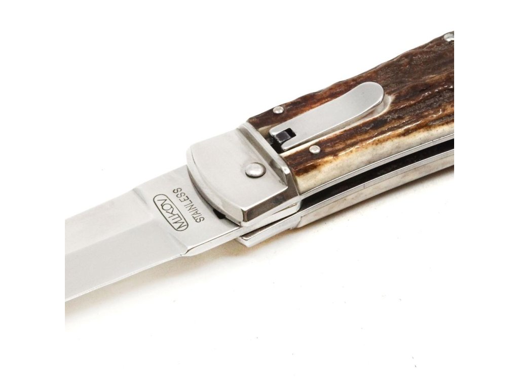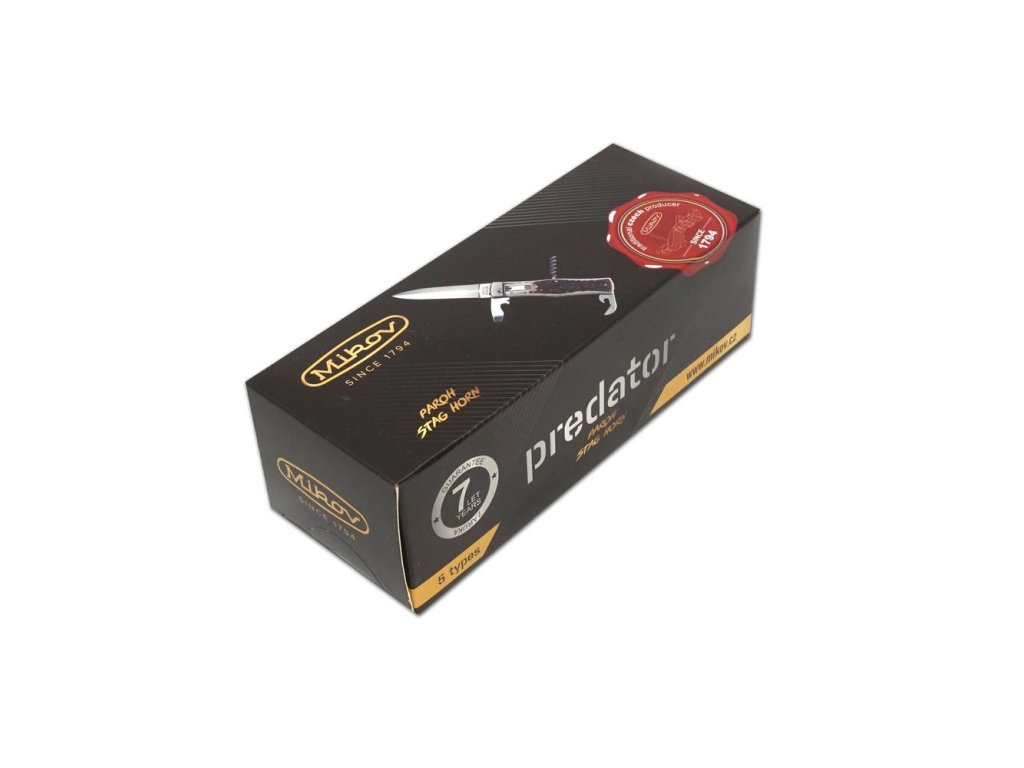 | Popis EN: | Switchblade PREDATOR knife 241-NH-1/KP<br><br>Is Czech made knife with great heritage of Czech knife making. One of the many advantages of PREDATOR is that the knife can be quickly opened with one hand from the side.<br>The knife blade is made of high-quality stainless steel 420 with a hardness of 52–55 HRc.<br>The handle of the knife is made of real deer antler, which is very popular among hunters and nature lovers. Its shape not only guarantees a pleasant and firm grip, but also prevents the hand from slipping and injuries.<br>The knife has a luxurious and elegant design. Upon the customer's request, it is possible to produce PREDATOR in a left-handed design (cannot be combined with a corkscrew!) And it is also possible to engrave a logo or lettering on the blade.<br>This PREDATOR is delivered including a luxurious leather case with a belt loop.<br>The knife is manufactured with 1-4 tools. For example with the main blade, saw, can opener or bottle opener with screwdriver, groove for easy stripping of cables and corkscrew.<br> <br> Number of functions: 1 <br> <br> Equipment: <br> Blade <br> <br> Material : <br> blade made of high quality stainless steel 420 with a hardness of 52-55 HRc <br> Handle from genuine antler <br> <br> Manufacturer: Mikov Mikulášovice <br> <br>The damaged pen can be easily replaced according to the instructions <a href="https://www.mikov.cz/s18968021-navod-na-vymenu-pera-vyhazovaciho-noze?lang=en">HERE</a><br><br> |