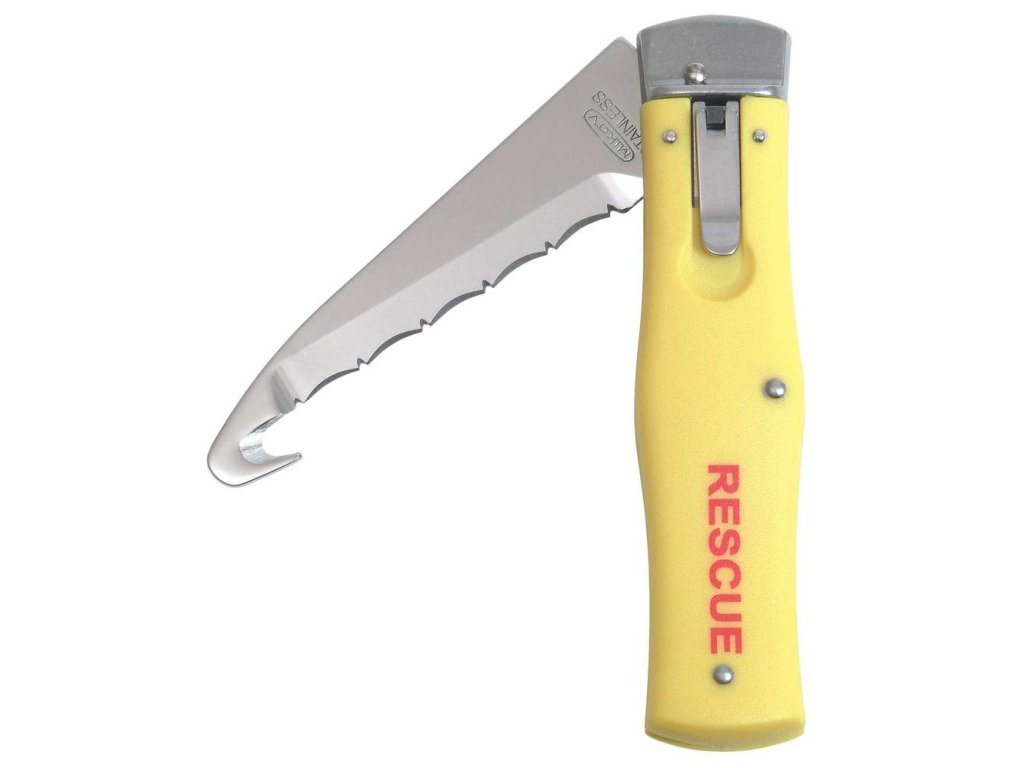 Nůž RESCUE je doporučen jako základní výbava každého záchranáře a užitečný pomocník pro mimořádné události v civilním životě. Robustní konstrukce nože RESCUE je zárukou jeho vysoké odolnosti a manipulaci s ním usnadňuje ergonomický tvar a zdrsnění střenek. Praktický klip umožňuje bezpečné nošení nože a žlutá barva napomáhá jeho snadnému nalezení. Speciální čepel zajišťuje vysokou řezivost popruhů ze syntetických vláken (například bezpečnostní pásy automobilů), ale i jiných materiálů, které je třeba přeříznout při zásahových akcích. Trhací háček rozšiřuje použití čepele například o možnost přetržení měděného vodiče. Oblé zakončení čepele je důležitým bezpečnostním prvkem pro manipulaci s nožem. Střenka nože je ze žlutého plastu ABS a má ergonomický tvar, perfektně padnoucí do ruky.