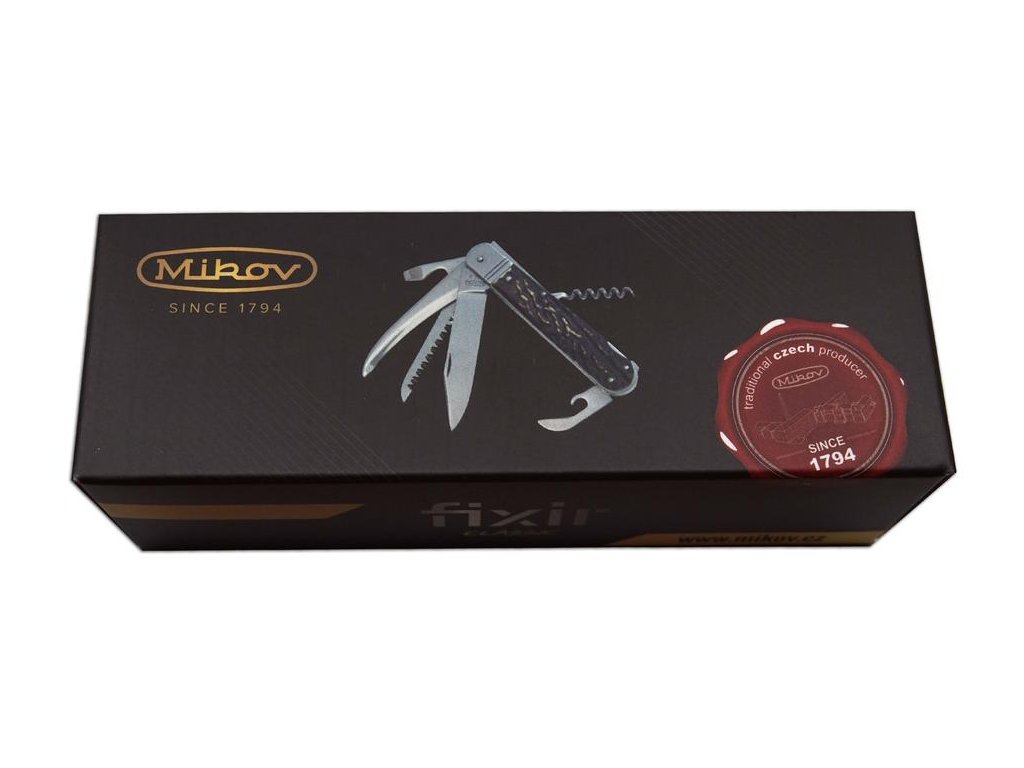 | Popis EN: | Folding hunting knife FIXIR 232-XH-6V <br> Traditional folding hunting knife FIXIR 232-XH-6V is a great hunting knife for every hunter. <br> EQUIPMENT: <br> Hunting knife FIXIR is equipped with a blade of high quality stainless steel 440A with a hardness of 56HRc. The blade of the hunting knife FIXIR has a conical cut, which allows not only better cutting, but also maintenance. This type of hunting knife FIXIR is also equipped with a quality saw with two rows of teeth, down blade, can opener, bottle opener which can also be used as a flat screw-driver and a coekscrew. Hunting knife FIXIR is equipped with a backlock for greater safety when working with the knife. Handles of FIXIR hunting folding knife are made of high quality antler imitation. Hunting knife FIXIR is supplied with a leather case with the Mikov logo and is packed to a gift box.<br> Hunting folding knife FIXIR is a traditional product of Mikov company, which is located in Bohemian Switzerland. |