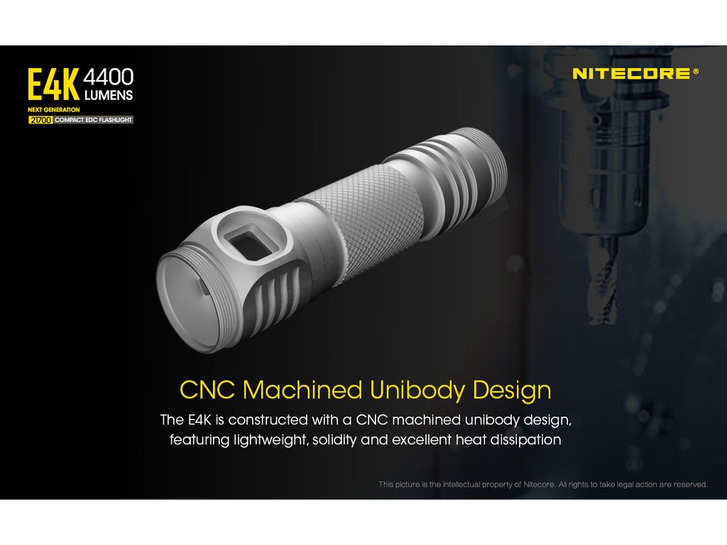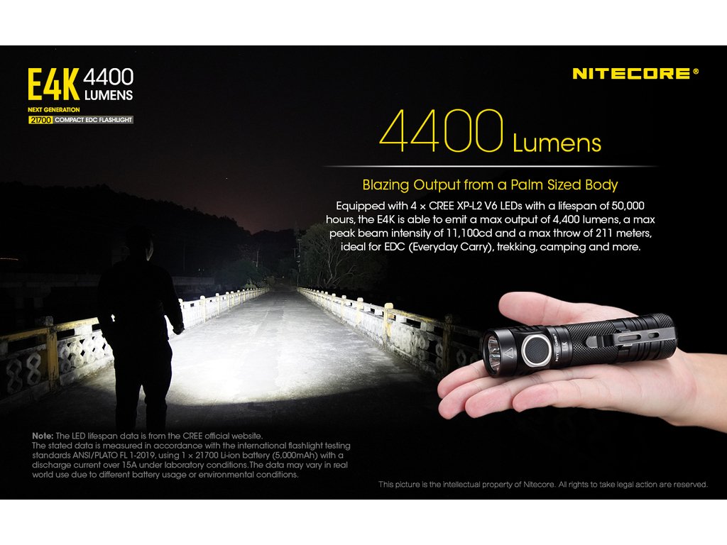 E4K je nová generace outdoorové nabíjecí LED svítilna, která jako zdroj světla používá 4 x LED CREE XP-L2 V6 s výkonem až 4 400 lm (11 100cd) a životností diod až 50 000 hodin. Výrobce o této svítilně říká, že je orientovaná na budoucnost. Díky použité elektronice je svítilna uzpůsobena na akumulátory typu 21700 (doporučeno používat aku Nitecore NL2150HPR o kapacitě 5000mAh, JE součástí balení). Tento akumulátor se nabíjí přes vestavěný USB-C port uložený přímo v těle akumulátoru. Dále svítilna funguje i na akumulátory RCR123A i lithiové baterie CR123A v kombinaci s plastovým pouzdrem na baterie. S těmito akumulárory a bateriemi však nedosahuje E4K svého maximálního výkonu. Na nízký režim (2 lumeny) svítilna funguje až neuvěřitelných 700 hodin. Nitecore E4K má nezávislé ovládání všech čtyř LED. Stav nabitosti svého akumulátoru si mužete překontrolovat za pomoci pěti modrých diod, treré jsou umístěny v hlavním spínači svítilny. Svítilna se ovládá novým inovovaným dvoustupňovým spínačem. Hluboká precisní parabola vytváří široký světelný paprsek s dosvitem 211 m. Vestavěný ATR modul kontroluje teplotu svítilny a upravuje výkon podle potřeby, aby byla svítilna vždy v optimálním stavu pro použití. Jako další technické přednosti svítiln E4K jsou: tělo vyrobené z pevného leteckého hliníku s povrchovou úpravou tvrdý elox HA III Military, paměť navoleného světelného výkonu, ochrana proti nesprávnému vložení baterie, jedmoduchý a čitelný spínač poskytující pohodlné a jednoduché ovládání, nerezový oboustranný klip a odolnost svítilny vůči vodě a nárazu dle normy IP68. To znamená, že je svítilna vodotěsná až do hloubky 2 metrů pod vodou a páduvzdorná až z výšky 1 metru.