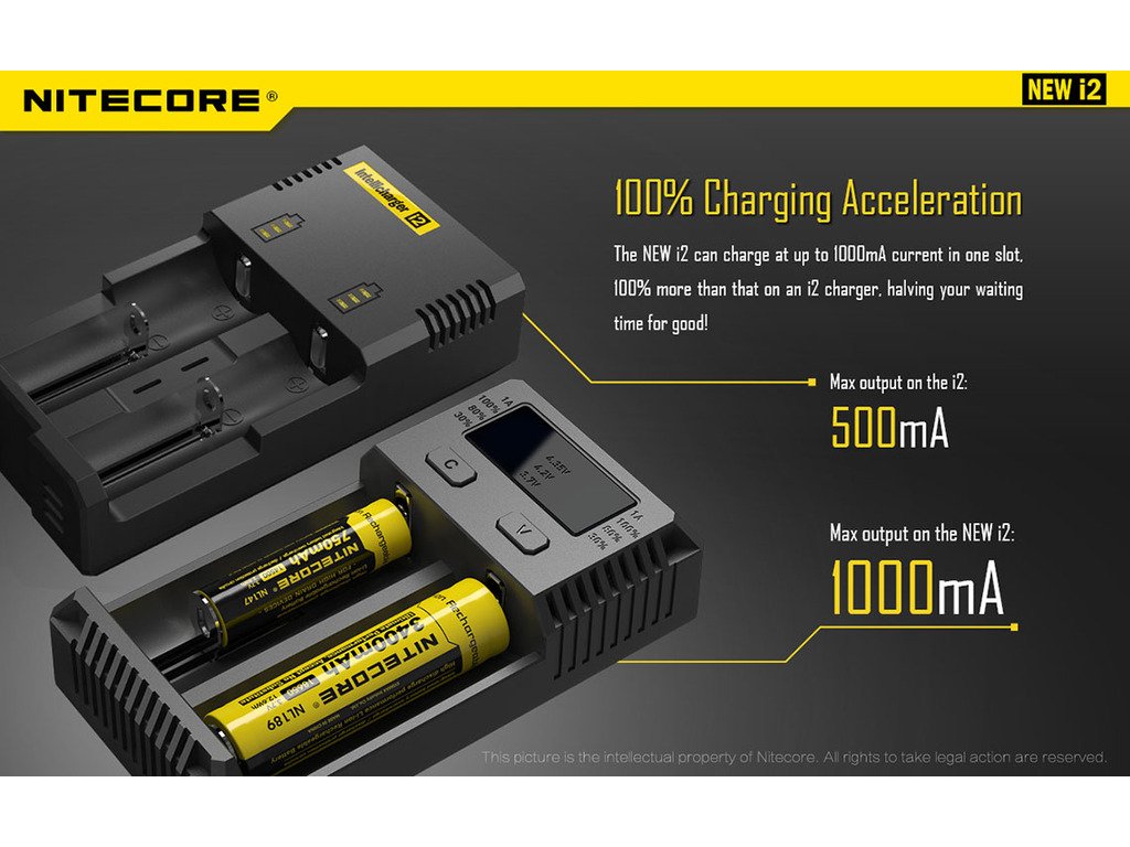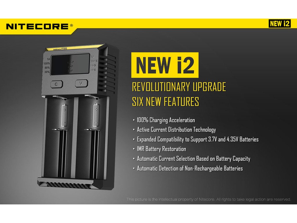 Nitecore i2 NEW je univerzální inteligentní nabíječka, kompatibilní téměř se všemi válcovými dobíjecími bateriemi. Nabíječka automaticky detekuje Li-ion, Ni-MH a Ni-Cd baterie. V nabíječce lze nabíjet akumulátory IMR a LiFePO4. Inteligentní nabíječ, vždy vybere optimální režim nabíjení (CC, CV a dV / dt) pro danou baterii a každý mikroprocesorem řízený nabíjecí slot pak monitoruje a nabíjí baterii samostatně. Nabíječka nabízí dva nabíjecí proudy - 500mA a 1000mA, velikost proudu je volena automaticky podle velikosti akumulátoru. Pokud nabíjíte v obou nabíjecích slotech současně, bude každý akumulátor nabíjen proudem 500mA. Jakmile je jeden z akumulátorů plně nabitý bude veškerý nabíjecí proud 1000mA proudit pouze do jednoho nabíjecího slotu a tím urychlí nabití akumulátoru. Nabíječka má barevný indikátor zobrazující stav nabíjení. Inteligentní automatika po úplném nabití, nabíjení ukončí. Nitecore i2 NEW je plně automatická inteligentní nabíječka.