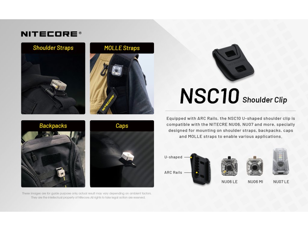 NITECORE NSC10 - Držák pro svítilny NU06 LE, NU06 MI a NU07 LE. Pokud chcete svou svítilnu / blikačku nosit jako poziční světlo na svém vybavení nebo výstroji, pak je držák svítilny NSC10 tou správnou volbou. NSC10 jednoduše nacvaknete na tělo své svítilny a za pomoci klipu přichytnete na požadovanou část oblečení nebo výstroje. Šikovný pomocník když o sobě potřebujete dát vědět za pomoci pozičních světel od Nitecore.