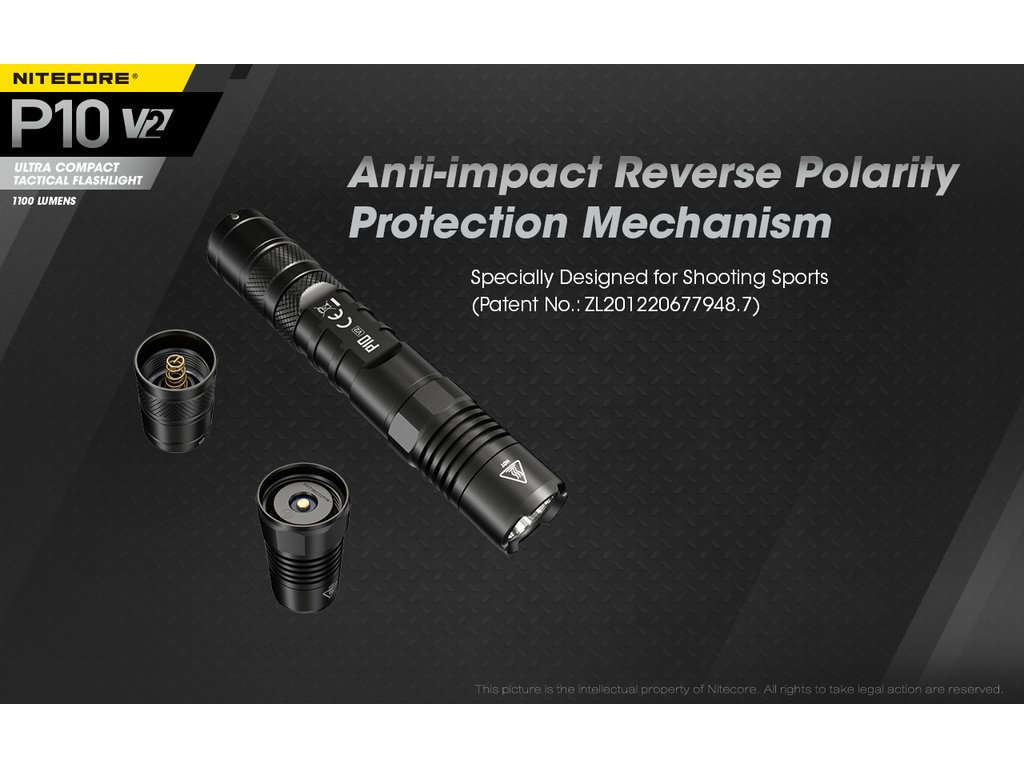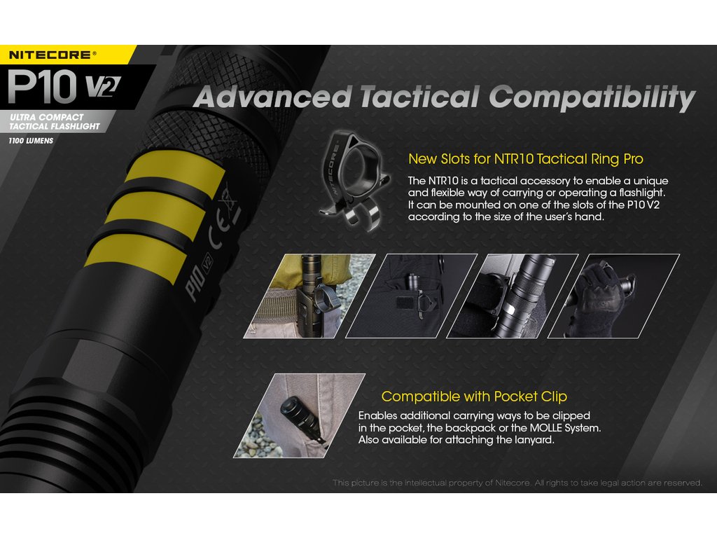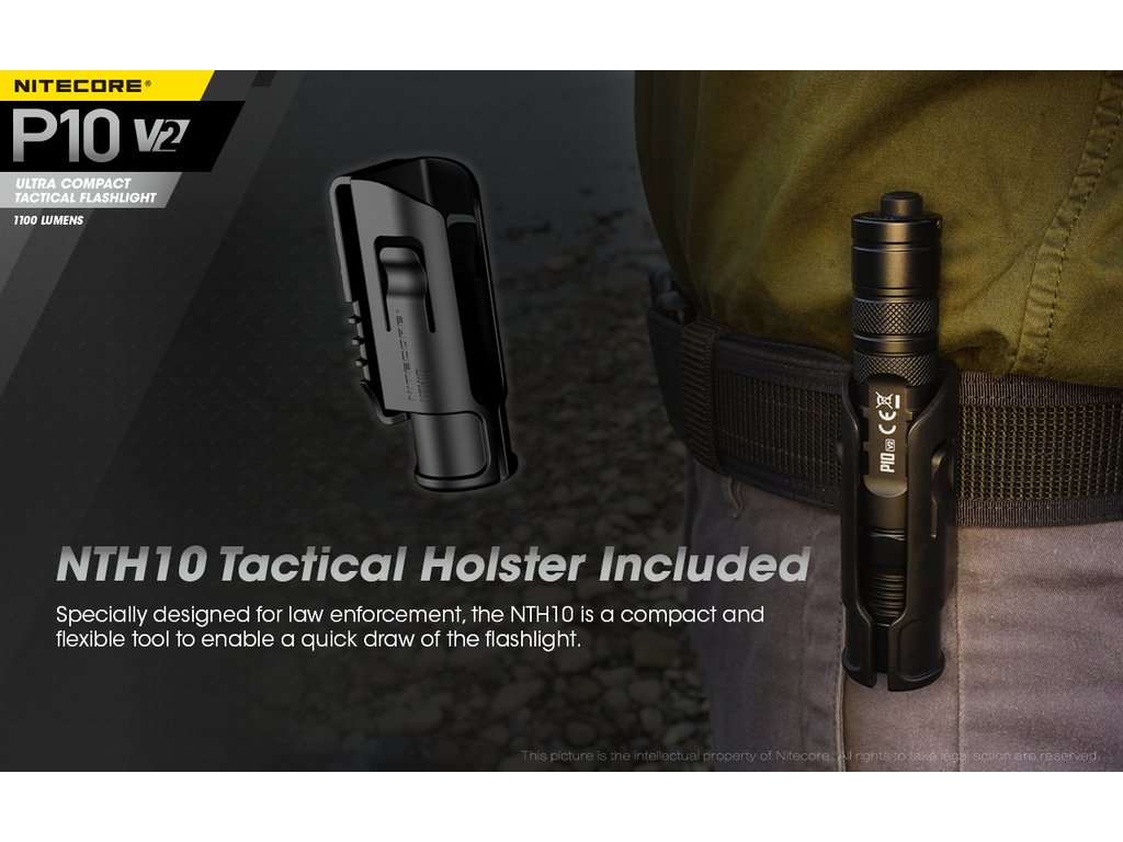 P10 V2 je nástupce taktické LED svítilny P10, která jako zdroj světla používá LED CREE XP-L2 V6 s výkonem max. 1100 lm. Díky použité elektronice je svítilna uzpůsobena na akumulátory 18650, RCR123A i lithiové baterie CR123A . Svítilna umožňuje volit mezi třemi nastaveními světelných režimů.:Taktický-umožňuje volbu vysokého výkonu a stroboskopu, Hlídkový-umožňuje volbu vysokého nebo středního výkonu a stroboskopu a Denní-umožňuje volbu buď vysokého,středního nebo nízkého výkonu a stroboskopu.Svítilna je opatřena duálním patním spínačem, který umožňuje okamžitou aktivaci stroboskopu. Precisní parabola vytváří světelný paprsek s dosvitem 201 m. Jako další technické přednosti svítilny P10jsou: tělo vyrobené z pevného leteckého hliníku s povrchovou úpravou HA III Military (černý elox), paměť navoleného světelného výkonu, ochrana proti nesprávnému vložení baterie, duální spínač poskytující pohodlné a jednoduché ovládání (patentováno), nerezový klip a odolnost svítilny vůči vodě a nárazu. Součástí balení je také praktické taktické pouzdro na opasek NTH10.