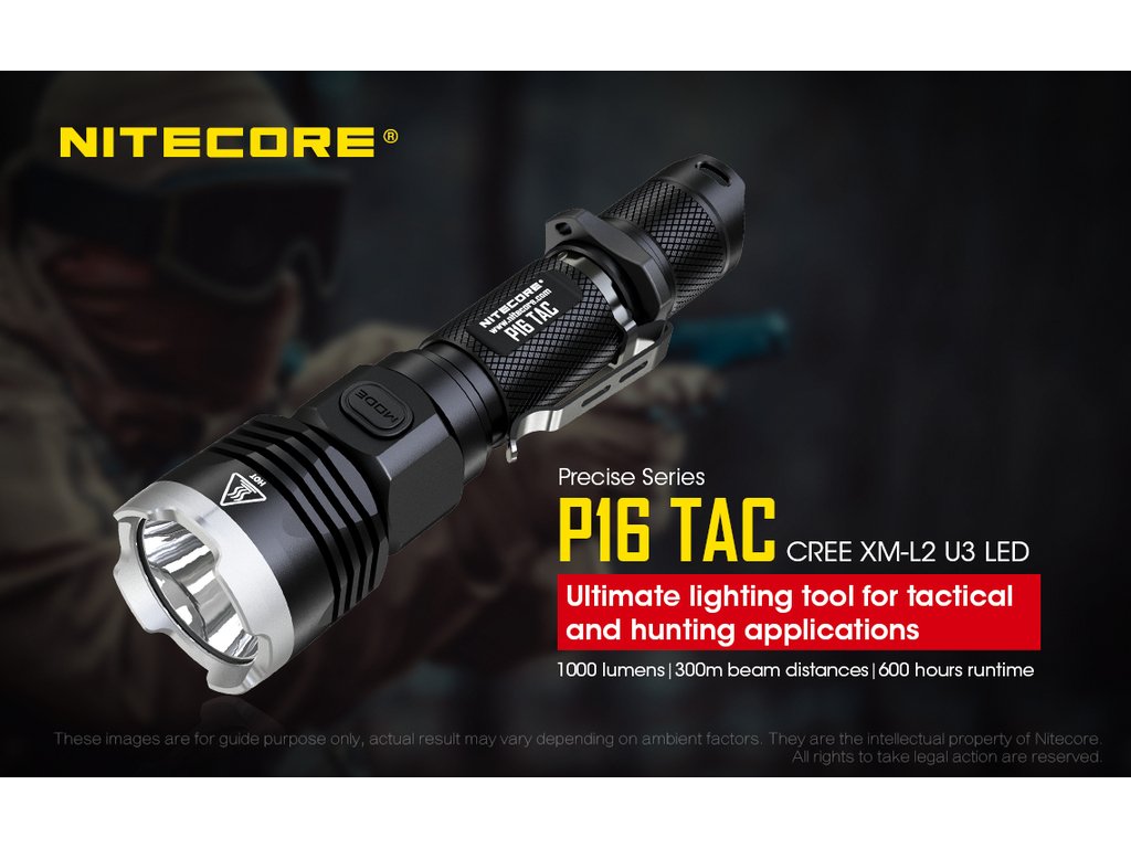 P16TAC je nová výkonná taktická/lovecká LED svítilna, která jako zdroj světla používá výkonnou diodu CREE XM-L2 (U3) LED s výkonem max. 1000 lm. Díky použité elektronice je svítilna uzpůsobena na akumulátory 18650, RCR123A i lithiové baterie CR123A . Bočním spínačem můžete volit režimy výkon: vysoký, střední, nízký, velmi nízký, stroboskop, SOS, světelné záblesky (maják). Hluboká precisní parabola vytváří úzký světelný paprsek s dosvitem 300 m. Jako další technické přednosti svítilny P16 TAC jsou: tělo vyrobené z pevného leteckého hliníku s povrchovou úpravou tvrdý elox HA III Military, paměť navoleného světelného výkonu, ochrana proti nesprávnému vložení baterie, boční spínač poskytující pohodlné a jednoduché ovládání (patentováno), oboustranný nerezový klip a odolnost svítilny vůči vodě a nárazu.