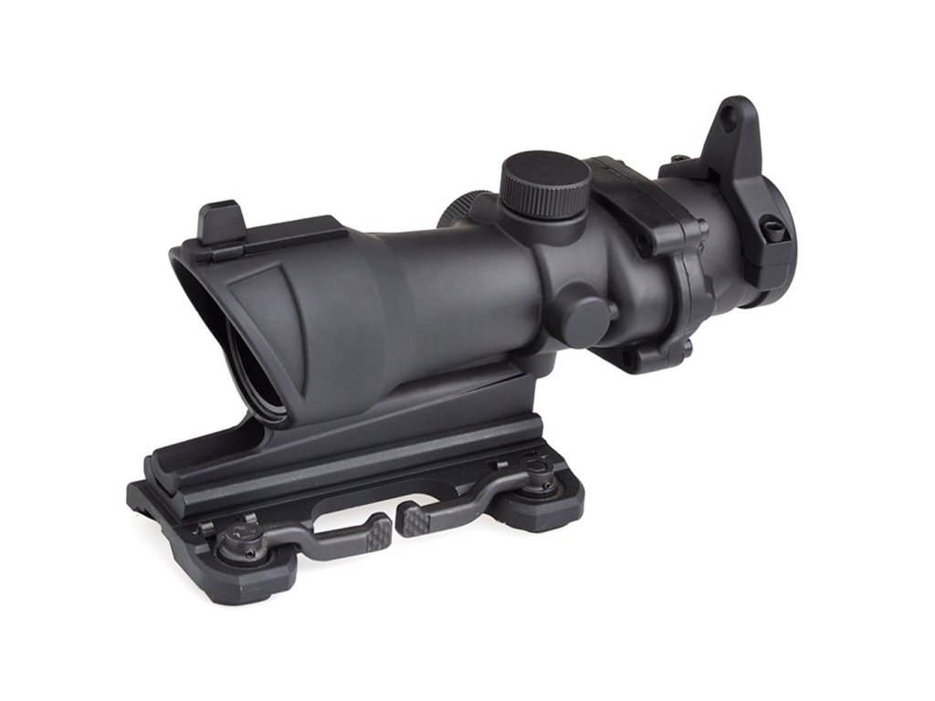 Puškohled ACOG 4x32 s QD montáží od výrobce Aim-O se snadno připevňuje na 20mm lištu RIS (2 přepínače QD jsou součástí balení). Puškohled má dvě záložní železná mířidla.