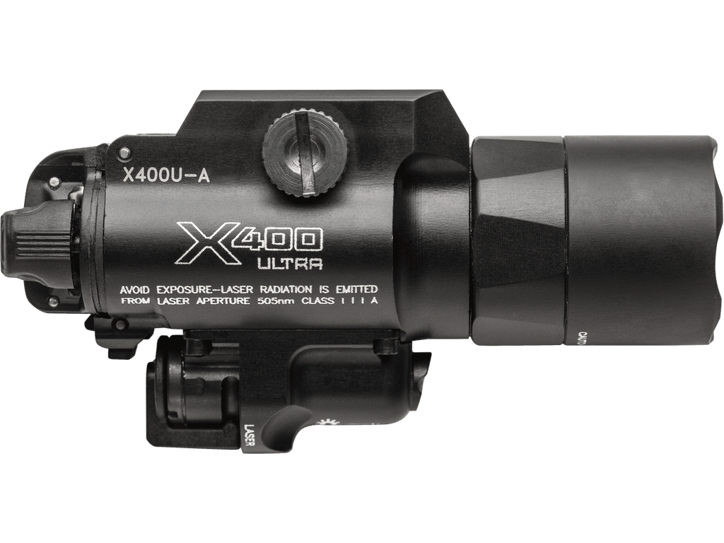 SureFire X400U podvěsná svítilna kombinuje perfektní bílé světlo s červeným laserem pro ještě lepší zaměřování. Vysoce výkonná LED vytváří perfektní bílé světlo o síle 1000 lumenů (11 300 candela) a díky TIR čočce jej soustřeďuje do úzkého kužele s dlouhým dosahem a dostatečnou dávkou periferního světla. Světlo je dostatečně silné aby přemohlo útočníkův zrak, který navyknutý na přítmí. Svítilna je napájena 2 x CR123A bateriemi, které jsou součástí balení a vydrží 1,75 hodiny provozu. 5 mW laser vydává vysoce viditelný červený paprsek o vlnové délce 635 nm. Mechanismus pro vycentrování laseru používá šrouby NYLOK, které se nepohnou při zpětném rázu, tudíž se málokdy stane, že je nutné laser potřeba znovu ladit. Svítilna se ovládá obouruč, spínačem na zadní části těla. Při lehkém stisku se světlo aktivuje dočasně, při přepnutí spínače lze svícení aktivovat permanentně.